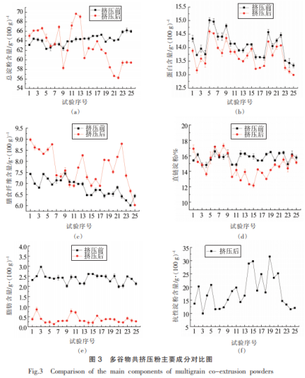 不一樣配制多谷類共壓擠粉主要成分成分對(duì)例如圖3所顯示。比照壓擠前、后多谷類共壓擠粉的木薯淀粉、直鏈淀粉、蛋白質(zhì)、脂肪率和纖維素成分,發(fā)覺(jué)壓擠后,除膳食纖維素成分提升外,其他4個(gè)成分發(fā)生差異水平的降低。在其中直鏈淀粉成分降低力度從23.70%到1.03%;蛋白質(zhì)含量降低力度從4.21%到1.15%,脂肪率降低力度最大,為94.27%。膳食纖維素成分提升,較大增加率為37.06%。壓擠后,多谷類共壓擠粉的抗性淀粉成分變動(dòng)范疇為0.09~0.31g/100g?,F(xiàn)有的研究表明壓擠使蛋白進(jìn)到木薯淀粉的螺旋式構(gòu)造內(nèi)部,產(chǎn)生不可溶木薯淀粉和蛋白雙螺旋結(jié)構(gòu)一氧化氮合酶。壓擠后,人體脂肪與木薯淀粉產(chǎn)生Ⅰ型木薯淀粉-人體脂肪一氧化氮合酶,膳食纖維素的構(gòu)成與構(gòu)造產(chǎn)生變化,木質(zhì)素和甲基纖維素溶解,因而,木薯淀粉、蛋白和脂肪率的減少,可能是蛋白與木薯淀粉、脂類與木薯淀粉融合,進(jìn)而危害木薯淀粉的消化吸收特點(diǎn)。此外,膳食纖維素成分提升有利于提升消化吸收管理體系的粘度,減緩消化吸收速度。