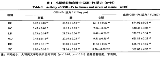 杏鮑菇廢菇柄發(fā)醇物對(duì)變老實(shí)體模型小白鼠機(jī)構(gòu)及血清蛋白中GSH-Px魅力的危害狀況如表1所顯示。