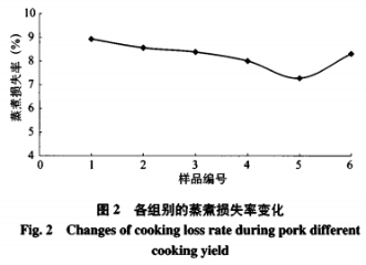 由圖2得知,伴隨著榮譽出品率的提升,仿真模擬腌肉食品的蒸制損率在遲緩降低,當(dāng)榮譽出品率做到143.7%時,蒸制損率逐漸提升。根據(jù)2、3、4、5、六號與2號比照,仿真模擬腌肉食品的蒸制損率轉(zhuǎn)變并不大。由于豬肉皮蛋白質(zhì)是一種有著極高鎖水工作能力的肉蛋白質(zhì),與肉中提煉的水溶肌漿蛋白和肌球蛋白(鹽溶性蛋白質(zhì))融合,可提升疑膠抗壓強度,與此同時會在肉粒內(nèi)部和肉粒間產(chǎn)生膜,進而避免水份從肉中進行析出,降低蒸制損害。