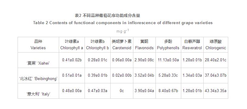 從表5能夠看得出,意味著紅提花序作用質(zhì)量的指數(shù)有光合色素、花青素、黃酮類、白黎蘆醇、綠原酸等,這種多功能性化學(xué)物質(zhì)大部分具備抗氧化性、防癌、防電磁輻射等作用。根據(jù)以上多功能性指標(biāo)值,對(duì)紅提花序的作用質(zhì)量開(kāi)展點(diǎn)評(píng),結(jié)果顯示,‘西班牙’花序的作用質(zhì)量最好是,‘北冰紅’其次,‘夏黑’較弱。根據(jù)該結(jié)果,‘西班牙’花序合適開(kāi)展精工細(xì)作生產(chǎn)加工,開(kāi)發(fā)設(shè)計(jì)出具備各種藥用價(jià)值作用的保健產(chǎn)品或食品類,或是對(duì)花序中的作用成份開(kāi)展獲取運(yùn)用,可普遍使用于食品類、藥物或護(hù)膚品行業(yè)。