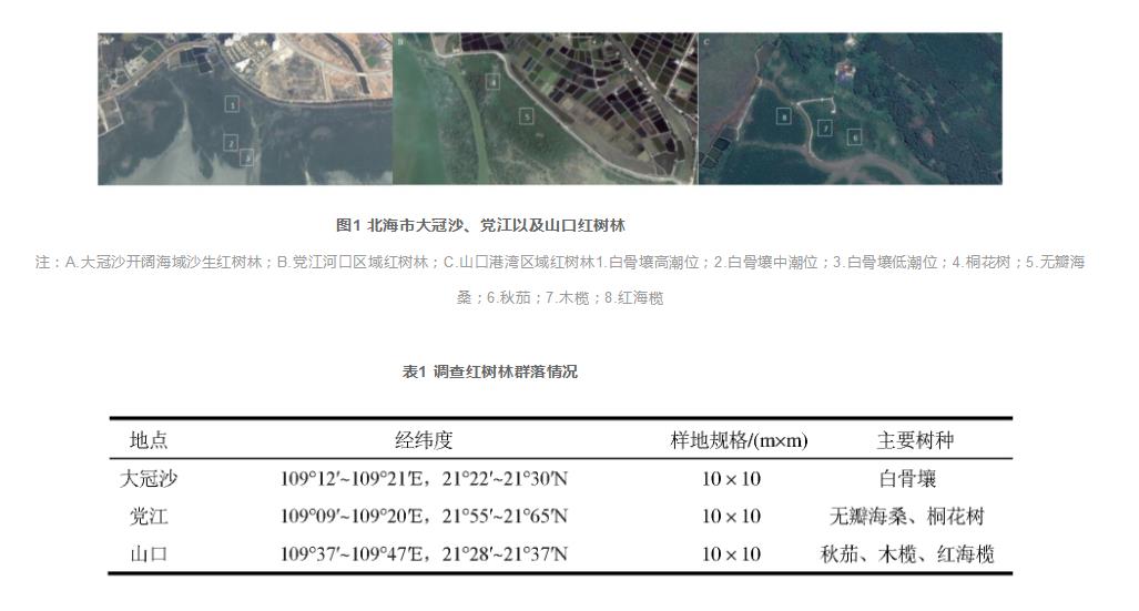 實(shí)驗(yàn)地坐落于欽州市大冠沙寬闊水域沙生紅樹林公園、黨河流口地區(qū)紅樹林公園、山口海港地區(qū)紅樹林公園,選擇8個(gè)樣地(圖1A、B、C),大冠沙地域樣地關(guān)鍵紅樹林公園綠化植物有尸骨壤(Avicennamarina),黨江地域樣地的首要綠化植物為無(wú)瓣海桑(Sonneratiaapetala)與桐枇杷樹(Aegicerascorniculatum),山口地域樣地關(guān)鍵植物有秋茄(Kandeliacandel)、木欖(Bruguieragymnorrhiza)與火爆欖(Rhizophorastylosa)(表1)。