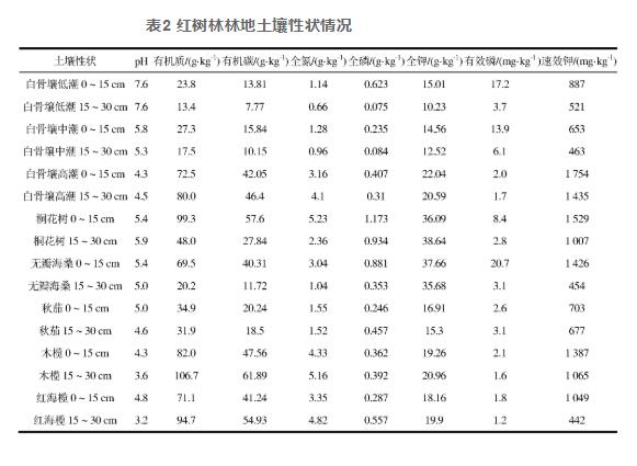 土壤層pH是至關(guān)重要的物理性質(zhì)指標(biāo)值,危害著土壤層營(yíng)養(yǎng)的實(shí)效性。由表2得知,除尸骨壤低谷地域土壤層為偏堿(pH為7.6),其他土壤層均為酸堿性。土壤有機(jī)質(zhì)做為土質(zhì)的關(guān)鍵構(gòu)成成份,盡管在土壤環(huán)境中成分占有率少,可是對(duì)土壤的形成和土壤環(huán)境的肥效等領(lǐng)域有著關(guān)鍵功效。土壤肥力成分亦危害土壤層氮和磷的全量及合理量。土壤層中有機(jī)碳的成分可體現(xiàn)土壤肥力水準(zhǔn),是土壤層品質(zhì)及土壤層身心健康的主要標(biāo)準(zhǔn)之一,可以危害土壤環(huán)境的肥效及其植物生長(zhǎng)生長(zhǎng)發(fā)育。從表2中可看得出,木欖15~30cm、桐枇杷樹0~15cm與火爆欖15~30cm土壤肥力成分較高,其相應(yīng)的有機(jī)碳成分亦較高。而尸骨壤低谷土壤層的有機(jī)物成分較低。