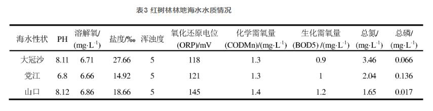 各自在大冠沙寬闊水域沙生紅樹林公園、黨河流口地區(qū)紅樹林公園、山口海港地區(qū)紅樹林公園潮溝中收集水質(zhì)采樣,每一個(gè)水質(zhì)采樣均為其取樣地址周邊的3處水質(zhì)采樣的混和水質(zhì)采樣。關(guān)鍵剖析測(cè)量水質(zhì)采樣的pH、溶氧、海水鹽度、濁度、氧化還原反應(yīng)電位差(ORP)、高錳酸鹽指數(shù)(CODMn)、化學(xué)需氧量(BOD5)、銅、鋅、鉛、鎘、高錳酸鹽指數(shù)及總磷指標(biāo)值,參考《海洋監(jiān)測(cè)規(guī)范.第4部分,海水分析:GBGB17378.4-2007》。