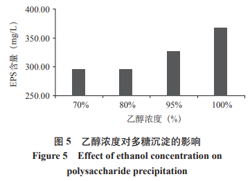 蛋白沉淀后各自依照1∶1、1∶2、1∶3、1∶4的料醇比添加含量為100%的酒精水溶液,測(cè)量胞外含糖量的生產(chǎn)量,如圖所示6所顯示。提升酒精加上容積能夠提升胞外含糖量的得到量,沉積中含糖量獲取率隨酒精加上倍率的提高而上升,可是當(dāng)酒精加上倍率在3~4倍時(shí),EPS成分明顯增強(qiáng),且都做到較濃度較高的,因此從獲取成本費(fèi)考慮到,最好的酒精加上倍率為3倍。