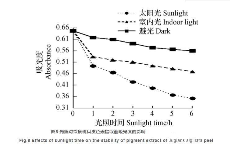 由圖8得知,當(dāng)外果皮黑色素萃取液在遮光、房間內(nèi)太陽光及自然光直射標(biāo)準(zhǔn)置放時(shí),其OD值伴隨著存放的時(shí)間的提高而降低,在其中,在自然光直射情況下的降低最顯著,在遮光情況下的降低最少;且黑色素色調(diào)均發(fā)生變淡,自然光直射下變淡最顯著,而遮光下色調(diào)變淡較少。因而,鐵核桃外果皮黑色素光可靠性不佳,合適在遮光情況下儲(chǔ)存。