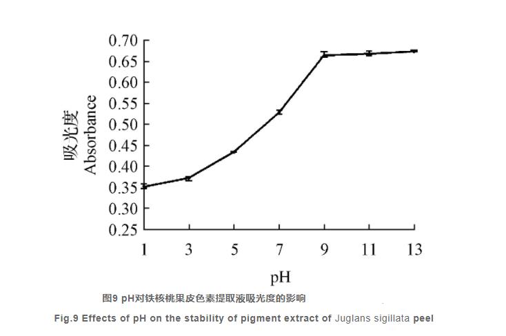 由圖9得知,伴隨著pH擴(kuò)大,外果皮黑色素萃取液的OD值持續(xù)擴(kuò)大,色調(diào)由黃棕色慢慢變成紅棕色最后變?yōu)樯詈稚?,與此同時(shí),在偏堿條件中也有小量沉積轉(zhuǎn)化成,這可能是因?yàn)殍F核桃仁外果皮黑色素會(huì)與堿產(chǎn)生化學(xué)變化。因此 ,該黑色素能夠依據(jù)具體色調(diào)必須,根據(jù)調(diào)整pH來達(dá)到,該結(jié)果與其他種類核桃仁黑色素的分析報(bào)導(dǎo)一致。