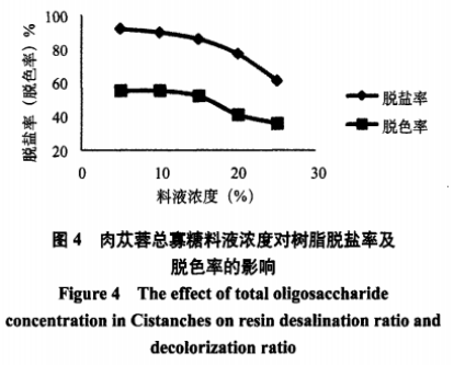 由圖4得知,伴隨著料液含量的提升,蓯蓉總低聚糖的除鹽率有些降低,與此同時(shí)其褪色率也隨著降低,很有可能由于蓯蓉低聚糖濃度值的提升,促使有一部分鹽正離子和黑色素趕不及和環(huán)氧樹(shù)脂互換,危害了蓯蓉低聚糖的提純,將料液濃度值基本確認(rèn)為0.1g/mL。