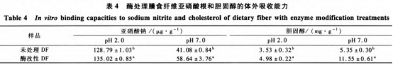 一些臨床流行病學研究表明,過多攝取亞硝酸鈉被指出對身體健康有危害,并有可能提升患惡性腫瘤的風險性。表4展示了酶改性材料前后左右DF的亞硝酸根吸收力(NIAC),酶改性材料后NIAC在仿真模擬結腸和胃的pH下均明顯提升(P<0.05)。結果顯示,酶改性材料后有利于避免過多亞硝酸鈉造成的身體中毒了。除此之外,發(fā)覺NIAC在pH2.0的標準下有更多的吸收力,表明DF在胃中比在腸里能消化吸收大量的亞硝酸根。不一樣pH下NIAC中間的差距可能是由DF中的阿魏酸造成的,酚酸官能團對亞硝基有極強的粘附功效,但在結腸自然環(huán)境中,因為pH值的上升促使阿魏酸上的羧基產生離解,進而抵觸NO2–,危害了活性炭吸附實際效果。