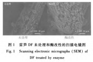 依據(jù)參考文獻,DF由井然有序結晶體區(qū)(70%)和非晶(30%)構成。非晶區(qū)由不定形甲基纖維素,木質素和木質纖維素構成。從圖3能夠看得出,酶改性材料先后的X射線衍射圖型在形態(tài)上類似,表明出典型性的甲基纖維素I結晶構形。沒有處理DF在掃描儀視角2θ為20.10o有顯著的結晶體透射峰,酶改性材料DF在掃描儀視角2θ為20.39o有顯著的結晶體透射峰,與此同時在34.55o處有一個弱透射峰。酶改性材料DF與沒有處理DF較為,結晶體峰的2θ值相仿,說明酶改性材料并沒有使晶體結構發(fā)生改變。由Jade5.0手機軟件線性擬合后發(fā)覺,酶改性材料后DF的晶粒大小(30.78%)小于沒有處理DF(33.72%),CAO等舊引發(fā)覺甲基纖維素I的(002)晶向在酶溶解歷程中優(yōu)先選擇水解反應,而且木質素一般與甲基纖維素相接,但其具備任意和不定形構造,非常容易被半纖維素酶水解反應,因而在纖維素酶前期的水解反應期內晶粒大小應當提升,殊不知結果與之相分歧。這有可能是由于伴隨著酶解時間的提升,較多的內切圓葡聚糖酶促使結晶體區(qū)表層甲基纖維素的生物大分子破裂,而且在外面切葡聚糖酶和甲基纖維素二糖酶的協(xié)同效應下徹底水解反應,造成結晶體區(qū)減少;與此同時,結晶體區(qū)一些位置分子結構鏈排序的混亂性由于外切葡聚糖酶的水解作用而提升,促使不定形區(qū)提升,兩層面的整體危害促使酶改性材料后DF的晶粒大小發(fā)生了減少。LE等K引報導了纖維素酶解決木槳化學纖維后甲基纖維素晶粒大小迅速減少。晶粒大小的減少說明DF的構造更加疏松,這和WHC、SC和吸咐工作能力的改進結果一致。