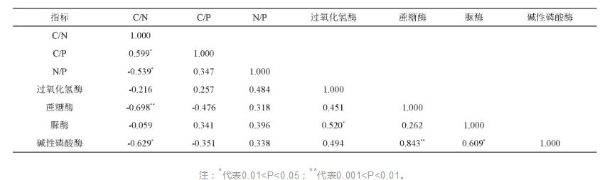 由表2得知,C/N與C/P呈明顯成正比,與N/P呈明顯成反比,C/P與N/P呈正相關(guān)的關(guān)聯(lián),這類正負(fù)極關(guān)聯(lián)性說(shuō)明三者間普遍存在著相互影響、均衡及牽制關(guān)聯(lián)。過(guò)氧化氫酶活力與脲酶活力呈明顯成正比,與C/N呈反比關(guān)聯(lián);綿白糖酶促反應(yīng)與堿性磷酸酶活力呈明顯成正比,與C/N呈明顯成反比,與C/P呈反比關(guān)聯(lián);脲酶活力與堿性磷酸酶活力呈明顯成正比,與C/N呈反比關(guān)聯(lián);堿性磷酸酶活力與C/N呈明顯成反比,與C/P呈反比關(guān)聯(lián)。表明土壤層綠色生態(tài)有機(jī)化學(xué)計(jì)量學(xué)特點(diǎn)與土壤層酶促反應(yīng)存有一定的關(guān)聯(lián)性。