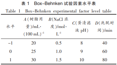 在單要素實驗的根基上,挑選環(huán)氧樹脂使用量(A)、過柱液NaCl濃度值(B)、雞蛋清滲瀝液pH值(C)、過柱時間(D)4個要素,每一個要素選擇低、中、高3個水準(表1),選用4要素3水準的回應斜面方式設計方案實驗,并以溶菌酶比魅力為指標值,明確最好獲取加工工藝。