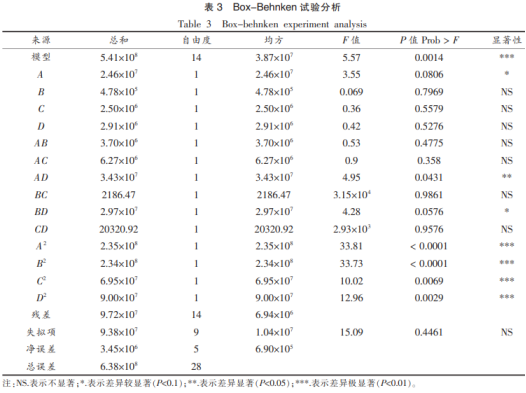 由式子得知,溶菌酶比魅力和4個(gè)變量中間具備明顯線性相關(guān)。線性回歸方程的二次項(xiàng)系數(shù)較為大,交互項(xiàng)指數(shù)中AD、BD的互動(dòng)指數(shù)非常大,表明環(huán)氧樹(shù)脂使用量和過(guò)柱時(shí)間、NaCl濃度值和過(guò)柱時(shí)間之間的互動(dòng)效用非常大,AB、AC的互動(dòng)指數(shù)比較大,表明環(huán)氧樹(shù)脂使用量和NaCl濃度值中間、環(huán)氧樹(shù)脂使用量和pH值中間互動(dòng)效用比較大,而B(niǎo)C、CD的互動(dòng)指數(shù)較為小,表明NaCl濃度值和pH值中間、pH值和過(guò)柱時(shí)間之間的互動(dòng)效用小。