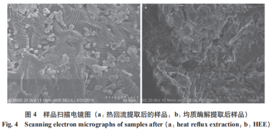 各自取3g預備處理試品,用勻質(zhì)酶解和熱逆流獲取五味子粗多糖,勻質(zhì)酶解提獲得率是10.01%,熱流回粗多糖提獲得率是7.13%,勻質(zhì)酶解獲取的提獲得率提升40.39%;勻質(zhì)酶解獲取時間2min,熱逆流獲取時間240min,時間減少了99.17%。為了更好地較為2種獲取技術的獲取高效率,對熱逆流獲取和勻質(zhì)酶解獲取后的試品機構選用透射電鏡開展了觀查,圖4(a)為熱逆流獲取后的五味子試品機構的宏觀構造,圖4(b)為勻質(zhì)酶解獲取后的樣本的宏觀構造。從透射電鏡圖可觀測到熱流回4h后的五味子試品變大600倍時,五味子組織細胞的宏觀構造相對來說較為詳細,而將勻質(zhì)酶解獲取后的試品變大400倍,觀查到組織細胞的宏觀構造有比較大水平的粉碎,這也是在高速分散機的強裁切和酶解的相同的作用下組織細胞有比較大水平的粉碎,有利于含糖量的迅速融解、蔓延,提獲得率大幅度提高、時間非常短、耗能減少。因而勻質(zhì)酶解得綠色植物活性多糖的獲取給予了一種高效率的翠綠色獲取技術性。