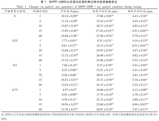 由圖1得知,因為SHPP-LMW可吸咐到水油頁面,因而加上SHPP-LMW可明顯減少乳濁液的表面張力(P<0.05)。在其中加上0.5%SHPP-LMW的乳濁液的表面張力為(50.89±0.14)mN/m,具備較低的界面張力,說明適當加上SHPP-LMW可提高乳濁液的頁面活力。次之加上0.25%SHPP-LMW和0.75%SHPP-LMW的乳濁液,表面張力各自為(52.23±0.57)mN/m和(52.77±0.39)mN/m,不加上SHPP-LMW的乳濁液的表面張力較高,為(62.79±0.13)mN/m,與加上SHPP-LMW的試品差別明顯(P<0.05)。許朵霞等討論乳清蛋白分離蛋白球甘藍阿拉伯膠共價鍵一氧化氮合酶的乳狀液平穩(wěn)特性,說明共價鍵一氧化氮合酶可減少表面張力,提升其乳狀液活力。比照加上0.5%SHPP-LMW的乳濁液的表面張力和加上0.75%SHPP-LMW的乳濁液的表面張力,伴隨著乳濁液濃度值的提高,乳濁液的表面張力也略微提升,表面張力越大,頁面魅力也就越大。殊不知加上0.25%SHPP-LMW的乳濁液與加上0.75%SHPPLMW的乳濁液的表面張力差別不明顯(P>0.05)。