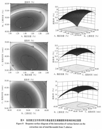 為檢測響應面法提升后的加工工藝穩(wěn)定性,考慮到實驗過程的可行性分析,融合單要素試驗結(jié)果,將以上獲取加工工藝標準調(diào)整為:酶加上量1.4%,乙醇濃度47.0%,獲取時間38.0min,獲取溫度39.0℃。在這里前提下,開展3組平行面實驗,所得的阿爾泰金銀花黃酮類物質(zhì)獲取率平均值為18.02±0.24%,與標準偏差的相對偏差為0.8%,線性回歸方程估計值與真實值相符合,表明應用響應面法提升獲得的建模主要參數(shù)精確靠譜,能真正反應各要素對阿爾泰金銀花黃酮類物質(zhì)獲取率的危害。