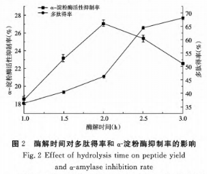 由圖2得知,伴隨著酶解時間的增加,活性多肽得率慢慢上升,這表明在蛋白液濃度值一定的標(biāo)準(zhǔn)下,酶解時間的增加使酶與蛋白的功效的時間越充足,蛋白被溶解的水平大,轉(zhuǎn)化成小分子水精彩片段的短肽越多,進而其活性多肽成分逐步上升。在1~3h中間酶解速度慢慢提升,在酶解前期,蛋白液中殘存的含糖量、生物大分子蛋白質(zhì)會沉積在量杯底端,伴隨著酶與底端生物大分子蛋白質(zhì)充足觸碰,酶解速度快速提升。α-胃蛋白酶活力抑制率發(fā)生先上升后下降的發(fā)展趨勢,在酶解時間為2h時,α-胃蛋白酶活力抑制率做到最高值27.1%,伴隨著酶解的連續(xù)開展,以前酶解獲得的α-胃蛋白酶抑止肽被酶解得更小分子水的肽段,進而活力抑制率減少??紤]到二種酶解實驗結(jié)果,挑選酶解時問2h為最好。