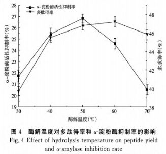 由圖4得知,活性多肽得率展現(xiàn)不斷上升發(fā)展趨勢,因為溫度的上升擴大了酶與蛋白質(zhì)分子結(jié)構(gòu)的觸碰機遇,酶的活性也隨著提高,活性多肽得率慢慢上升,α-胃蛋白酶活力抑制率也隨著上升,在50℃做到最高值26.8%,接著發(fā)生減少,溫度超出60℃很有可能會立即使小分子活性肽進一步離解,缺失抑止活力,進而使α-胃蛋白酶活力抑制率降低。因而,挑選酶解溫度在50℃上下。