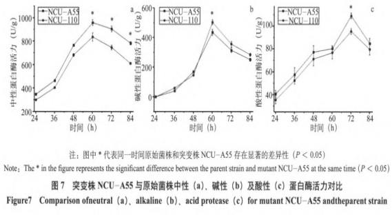 由圖7a得知,基因突變株NCU—A55與初始菌種的中性蛋白酶魅力酒曲制作60h前并無顯著性差異,在60~84h時(shí),基因突變株的中性蛋白酶魅力明顯高過初始菌種,并在60h基因突變株的中性蛋白酶魅力最大,做到958.8U/g,較初始菌種酶魅力提高了14.7%;由圖7b和7c得知,基因突變株堿性蛋白酶魅力和酸堿性胰蛋白酶魅力最高值各自發(fā)生在酒曲制作60h、72h,做到435.9U/g、109.1U/g,比初始菌種降低13.5%、提高了14.2%。試驗(yàn)結(jié)果與曹小琴運(yùn)用低要N 電子束引入技術(shù)性培育生抽釀制用菌米曲霉結(jié)果比較一致,其培育的米曲霉基因突變株胰蛋白酶魅力比初始菌種提升了36%,而本實(shí)驗(yàn)操作中,選用新式的電子束引入技術(shù)性,ARTP誘變初始菌種,培育獲得的米曲霉基因突變株在其中性、酸堿性胰蛋白酶魅力均明顯提高,其有可能的因素是等離子技術(shù)中的活力顆粒功效于菌種體細(xì)胞,造成菌種植物細(xì)胞和細(xì)胞的結(jié)構(gòu)特征及滲透性發(fā)生改變并造成遺傳基因損害,進(jìn)而造成菌體一系列的生理學(xué)轉(zhuǎn)變,擴(kuò)張了該菌種本身針對泥齡的要求,但相關(guān)堿性蛋白酶活力降低的因素也有待進(jìn)一步的科學(xué)研究。