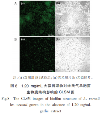 氣單胞菌屬的涂膜工作能力是受人群磁感應(yīng)管控的。根據(jù)結(jié)晶紫染色法和cLSm技術(shù)指標分析蒜頭提取液對維氏氣單胞菌生物膜系統(tǒng)產(chǎn)生工作能力的危害,結(jié)果見圖7、圖8。剖析得知,大蒜提取物對維氏氣單胞菌的生物膜系統(tǒng)產(chǎn)生有顯著性的抑制效果(P<0.05),且大蒜提取物的濃度值與其說抑止活力呈量效關(guān)聯(lián)。與實驗組對比,在1.20mg/mL大蒜提取物的效果下,尿培養(yǎng)24h后建立的生物膜系統(tǒng)量明顯減少36.7%(P<0.05)。根據(jù)剖析維氏氣單胞菌涂膜構(gòu)造的轉(zhuǎn)變,發(fā)覺經(jīng)1.20mg/mL大蒜提取物解決,該病菌產(chǎn)生的生物膜系統(tǒng)體細胞相對密度顯著減少,構(gòu)造比較松散。LI等發(fā)覺大蒜精油中的人群磁感應(yīng)活性物質(zhì)能高效抑止銅綠假單胞菌的生物膜系統(tǒng)造成及膜中的病菌總數(shù)。BjarnSholT等研究發(fā)現(xiàn),大蒜提取物解決后銅綠假單胞菌產(chǎn)生的細胞外基質(zhì)對抗菌素的耐受力大幅度降低。運用人群磁感應(yīng)緩聚劑影響食源性腐壞菌或病菌的生物膜系統(tǒng)產(chǎn)生,可減少微生物菌種環(huán)境污染,提升食品工業(yè)的安全系數(shù)。