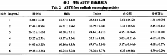 2、不一樣制取的大黑豆分離蛋白消除ABTS 氧自由基工作能力