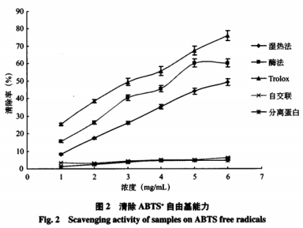 由圖l由此可見:濃度值為lmg/mL~6mg/mL酶法糖基化大黑豆蛋白質(zhì)、寒濕法糖基化大黑豆蛋白質(zhì)及其TroloxDPPH氧自由基清除率均高過自化學(xué)交聯(lián)大黑豆蛋白質(zhì)及其大黑豆分離蛋白,自化學(xué)交聯(lián)大黑豆蛋白質(zhì)及其大黑豆分離蛋白隨濃度值的提高DPPH氧自由基清除率無顯著性差異轉(zhuǎn)變,濃度值為lmg/mL~4mg/mL,酶法糖基化大黑豆蛋白質(zhì)、寒濕法糖基化大黑豆蛋白質(zhì)及其TroloxDPPH氧自由基清除率隨濃度值的提高而擴(kuò)大,濃度值為5mg/mL~6mg/mL酶法糖基化大黑豆蛋白質(zhì)、寒濕法糖基化大黑豆蛋白質(zhì)及其TroloxDPPH氧自由基清除率無顯著性差異,由表l得知,當(dāng)濃度值為6mg/mL時(shí),酶法糖基化大黑豆蛋白質(zhì)、寒濕法糖基化大黑豆蛋白質(zhì)及其TroloxABTS 清除率做到較大,Trolox為90.67%,酶法糖基化大黑豆蛋白質(zhì)為81.76%,寒濕法糖基化大黑豆蛋白質(zhì)為75.37%;當(dāng)濃度值為5mg/mL時(shí)自化學(xué)交聯(lián)大黑豆蛋白質(zhì)ABTS 清除率做到較大為9.35%,當(dāng)濃度值為4mg/mL時(shí)大黑豆蛋白質(zhì)ABTS 清除率做到較大為7.73%;五種試品消除DPP腎氧自由基工作能力尺寸為Trolox>酶法糖基化大黑豆蛋白質(zhì)>寒濕法糖基化大黑豆蛋白質(zhì)>自化學(xué)交聯(lián)大黑豆蛋白質(zhì)>大黑豆分離蛋白。