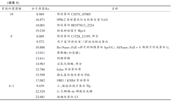 表4為產(chǎn)病菌素枯草芽孢菌的LC-MS/MS評(píng)定結(jié)果。融合Tricine-SDS-PAGE電泳原理實(shí)驗(yàn)最后能夠分析判斷菌種O生產(chǎn)病菌素很有可能為13ku尺寸的帶有DUF1093結(jié)構(gòu)域的蛋白、13.506ku尺寸的YlbF大家族管控蛋白質(zhì)及18.877ku的1型谷氨酰胺轉(zhuǎn)移酶;菌種19造成的病菌素很有可能為8.969ku的假定蛋白質(zhì)CXF51_07005、16.871ku尺寸的SPBc2原噬菌體衍化的蛋白YolA及其18.001ku尺寸的假定蛋白質(zhì)BEST7613_2224;菌種F生產(chǎn)病菌素很有可能為分子質(zhì)量尺寸為8.089ku的假定蛋白質(zhì)C1T28_21195、13.011ku尺寸的溶解酶(加氧酶)、15.786ku尺寸的holin大家族蛋白及其分子質(zhì)量為17.082ku的SMI1/KNR4大家族蛋白質(zhì);菌種4-1造成的病菌素很有可能相匹配為9.439ku的小分子質(zhì)量的酸可溶胞子蛋白質(zhì)Tlp或者分子質(zhì)量為22.529ku的3-己酮糖-6-硫酸銨合酶。現(xiàn)階段的結(jié)論與蛋白質(zhì)數(shù)據(jù)庫(kù)查詢內(nèi)已編碼的蛋白質(zhì)較為,沒(méi)有完全一致的蛋白質(zhì)相符合,說(shuō)明本分析中看到的病菌素不清除為新式病菌素的很有可能。病菌素進(jìn)一步提純,碳水化合物序列比對(duì)和產(chǎn)病菌素的病菌全基因組序列開(kāi)展轉(zhuǎn)錄組測(cè)序剖析,進(jìn)而精確分辨這4株枯草芽孢菌生產(chǎn)病菌素是不是為新式病菌素。