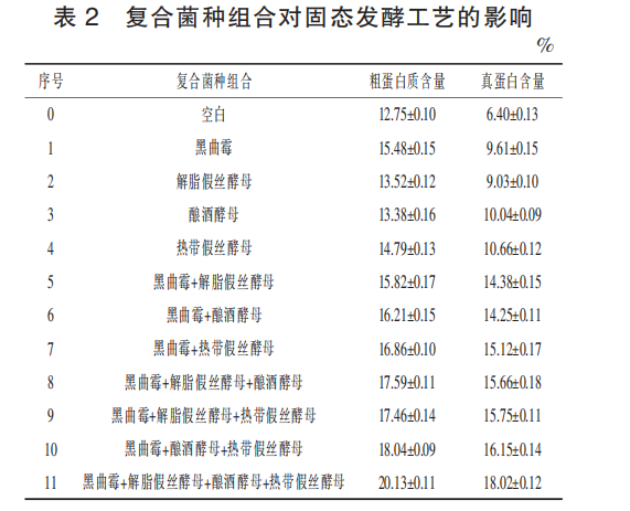 實驗固定不動原材料質量比(薯渣∶麥麩)為 85∶15、硫酸銨加上量 2%、塑造溫度 32 ℃、接菌量均為 1%,研 究不一樣菌種組成對粗脂肪和真蛋白質的危害 (表 2),不一樣菌種組成對發(fā)醇物質的粗脂肪、真蛋白質 和可溶糖成分危害很大, 黑曲霉 解脂假絲酵母 釀酒酵母 亞熱帶假絲酵母發(fā)醇物質的粗蛋白 質 和 真 蛋 白 含 量 值 最 高 , 分 別 為 20.13% 和18.02%,是因為黑曲霉做為糖化作用菌種為酵母菌 菌的自然環(huán)境給予可溶性糖, 進而做到互利共生 的功效。