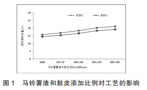 固定不動硫酸銨加上量 2%、塑造溫度 32 ℃、塑造時 間 72 h、 黑曲霉 亞熱帶假絲酵母 解脂假絲酵母 釀酒酵母接菌量均為 1%, 科學研究土豆薯渣與麩 皮不一樣原材料質量比對真蛋白質年增長率指標值的危害,結果見圖 1。