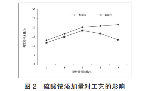 伴隨著硫酸銨加上量的逐步擴大, 發(fā)醇產(chǎn)品中粗脂肪指標值成分逐步擴大, 真蛋白質成分先提高后減少,當硫酸銨成分高過 2%時,過多的無機物氮 源抑止微生物菌種菌體的成長發(fā)育, 光合作用減少造 成無機物氮轉換菌體蛋白質的實力得到抑止; 當鹽酸 銨 含 量 為 2% 時,真蛋白質含 量 指 標 為 最 高 值(18.37±0.15)%。