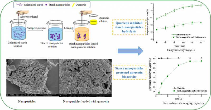 黎麥木薯淀粉因其粒度小、短支鏈淀粉鏈成分多的獨特特性,有益于納米技術化改性材料。黎麥木薯淀粉納米顆粒粒度為166.25 nm,可做為活性物質原兒茶醛的媒介,載荷率是26.62%,好于玉米粉;黎麥木薯淀粉納米顆粒根據(jù)共價鍵與原兒茶醛相互影響,更合理地保障和增加了原兒茶醛生物活性。科學研究結果表明了納米技術化改性材料對黎麥木薯淀粉特性的危害,表明了黎麥木薯淀粉納米顆粒與原兒茶醛間的構效關系,為木薯淀粉基生物活性化學物質媒介的制取以及在Pickering乳液中的使用給予理論來源。該科研成果《Preparation and characterization of quinoa starch nanoparticles as quercetin carriers》