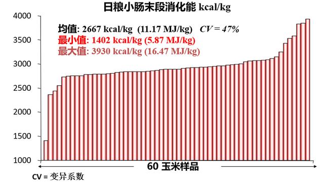 除開不一樣原材料自身的構(gòu)成差別外,同一種原材料不一樣批號、不一樣原產(chǎn)地、不一樣時節(jié),其營養(yǎng)成分水準和構(gòu)成也各有不同。以苞米為例子,不一樣時間段的苞米粗蛋白成分也不同樣,整體而言上半年度獲得的苞米粗蛋白成分高過后半年(表2)。不僅僅是苞米存有基因變異,別的原材料也具有相似的狀況,例如麥子麥麩中碳水化合物成分的構(gòu)成等(表3)。這類差別有可能會致使在生物身體營養(yǎng)物質(zhì)釋放出來的不一樣,以苞米為例子,其在肉食雞結(jié)腸尾端消化吸收能呈現(xiàn)出很大的基因變異,較大和最少消化吸收會差2528 kcal/kg,CV值做到47%(圖1)。而一切正常在非特殊情況下(應(yīng)激反應(yīng)、病癥感柒、免疫刺激等),其小動物的主要營養(yǎng)成分需要是一致的。針對秘方師而言,怎樣降低批號間差別造成 的小動物特性差別也是一大挑戰(zhàn)。怎樣尋找一個“熨斗”,來“燙平”精飼料批號間的不一樣,保證精飼料品質(zhì)的平穩(wěn),進而確保動物生產(chǎn)特性和身心健康十分重要了。