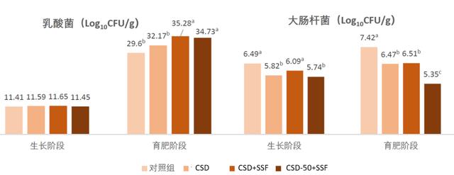 在這個實驗中對腸道微生物兩棲綱開展了統(tǒng)計分析,結(jié)果看到在特威寶SSF應(yīng)用的情形下,腸胃內(nèi)乳酸菌飲料總數(shù)明顯提升而大腸埃希菌總數(shù)明顯降低。這也說明特威寶SSF對腸道微生物兩棲綱管控層面也激發(fā)了至關(guān)重要的功效(圖4)。