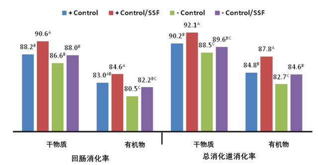 結(jié)果看到在基本日糧上加上特威寶SSF能各自提升回腸和總消化系統(tǒng)干物質(zhì)吸收率2.65%和2.06%,有機化合物的吸收率各自提升1.89%和3.42%。而調(diào)節(jié)秘方后的解決組根據(jù)應(yīng)用SSF,回腸和總消化系統(tǒng)干物質(zhì)吸收率各自提升1.58%和1.23%,有機化合物的吸收率各自提升2.07%和2.25%(圖3)。整體而言,無論是在基本日糧或是秘方更改后的日糧中應(yīng)用特威寶SSF都能夠提升生物的吸收使用率,改進精飼料應(yīng)用狀況,此外秘方更改后的日糧相互配合特威寶SSF的運用能做到基本日糧的實際效果,說明酶制劑的運用能夠附加釋放出來精飼料中的動能、鈣等營養(yǎng)物質(zhì)。