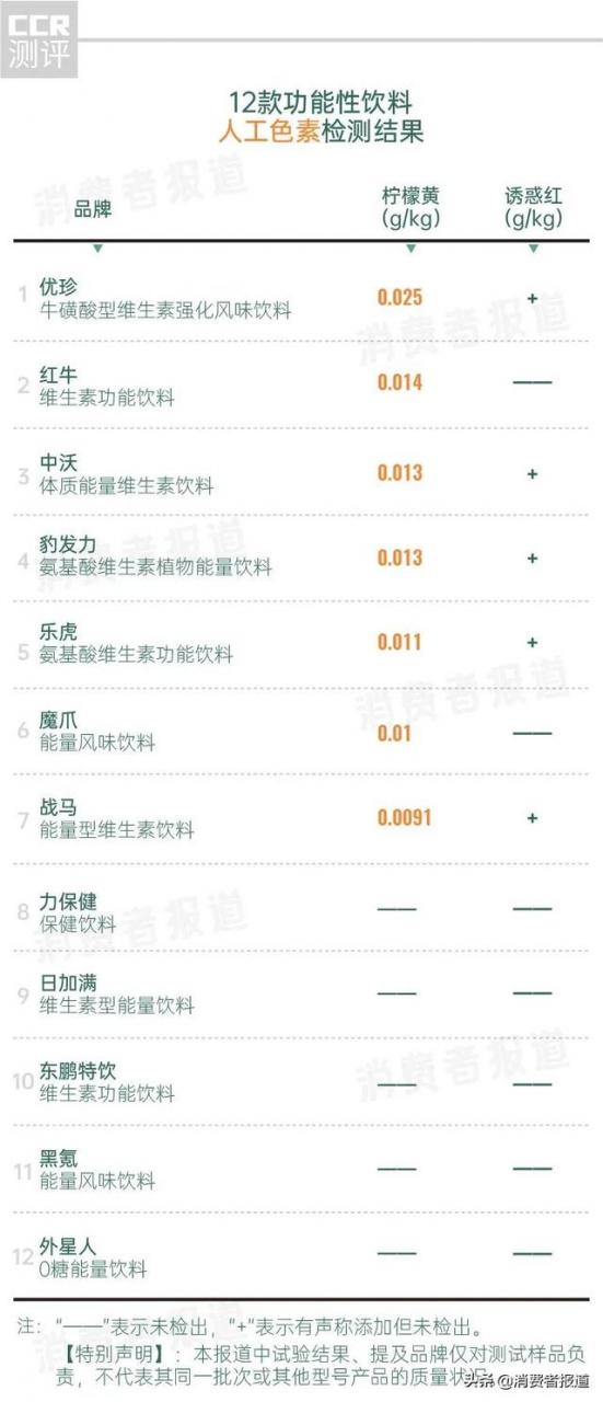 4、雖然添加劑、人力黑色素及甜味素的驗(yàn)出量均合乎國(guó)家行業(yè)標(biāo)準(zhǔn),可是,由于食用功能飲料的效果是填補(bǔ)動(dòng)能、抵御疲憊,刊發(fā)提議顧客盡可能挑選食用添加劑少或無(wú)的飲品。