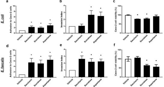 除此之外,全部三種甜味素都造成 高致病腸道細(xì)菌侵入在腸腔中看到的Caco-2體細(xì)胞,但人造糖以外,它對(duì)大腸埃希菌的侵入沒(méi)有顯著危害。