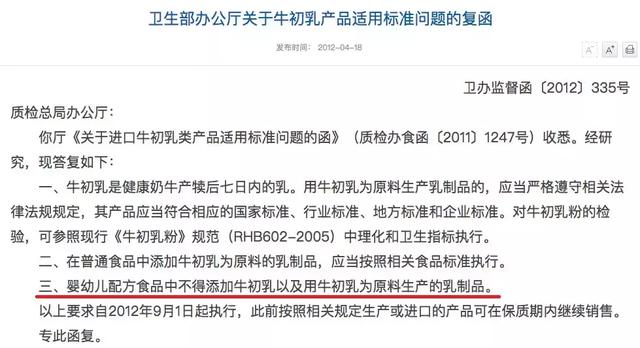 但是抽臉的是,2012年《衛(wèi)生部辦公廳關(guān)于牛初乳產(chǎn)品適用標(biāo)準(zhǔn)問(wèn)題的復(fù)函》中早就明確提出——