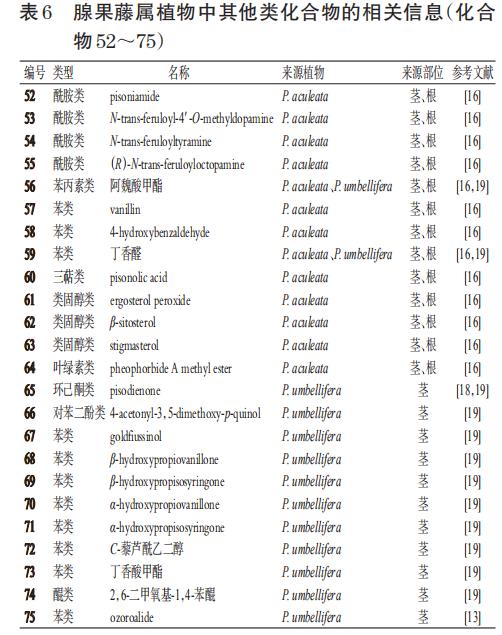 吳明純從腺果藤的根和莖中分離出來評定出氟苯類(化學(xué)物質(zhì)52~55)、苯丙素類(化學(xué)物質(zhì)56)、正已烷(化學(xué)物質(zhì)57~59)、三萜類(化學(xué)物質(zhì)60)、類固醇激素類(化學(xué)物質(zhì)61~63)和葉綠素類(化學(xué)物質(zhì)64)化學(xué)物質(zhì)。Kuo等從臺灣的膠果樹中分離出來評定出環(huán)己酮類(化學(xué)物質(zhì)65)化學(xué)物質(zhì)。郭秀婷從膠果樹莖中分離出來出環(huán)己酮類(化學(xué)物質(zhì)65)、對苯二酚類(化學(xué)物質(zhì)66)、正已烷(化學(xué)物質(zhì)56、59、67~73)和醌類(化學(xué)物質(zhì)74)化學(xué)物質(zhì)。Liu等從膠果樹莖中分離出來出正已烷(化學(xué)物質(zhì)75)化學(xué)物質(zhì)。之上化學(xué)物質(zhì)的構(gòu)造見圖6,其有關(guān)信息見表6。