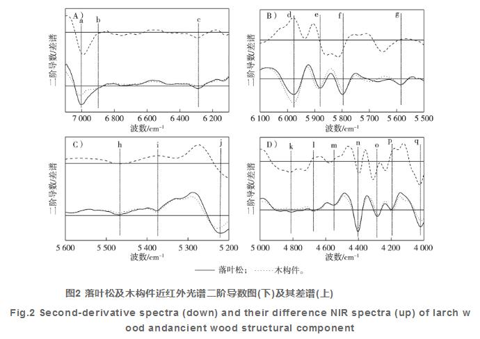 在譜帶范疇4000~5000cm-1內(nèi)(圖2D),二階導(dǎo)數(shù)譜圖發(fā)生7個(gè)吸收譜帶,各自坐落于4808,4675,4546,4404,4289,4195和4019cm-1處。在其中,k、n、o和q屬于甲基纖維素結(jié)晶體區(qū)或半結(jié)晶體區(qū),其差譜均為負(fù)數(shù),說(shuō)明木結(jié)構(gòu)建筑中纖維和木質(zhì)素成分降低,而屬于木質(zhì)纖維素的l和m處,其差譜值則為恰逢,說(shuō)明木質(zhì)纖維素的相應(yīng)成分有所增加。在譜帶4675cm-1處,目前參考文獻(xiàn)末見(jiàn)其所屬。因?yàn)樵谧V帶范疇4000~5000cm-1內(nèi),主要是CH官能團(tuán)的升縮震動(dòng)及形變震動(dòng)為主導(dǎo),因而,融合有機(jī)化學(xué)成分定性分析的結(jié)果,推論該譜帶屬于木質(zhì)纖維素,臨時(shí)把該譜帶屬于CH官能團(tuán)的升縮震動(dòng)與形變震動(dòng)的合頻。