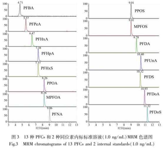 因而,本試驗(yàn)選用AtlantisT3離子交換柱,以2.5mmol/L乙酸銨甲醇溶液-2.5mmol/L乙酸銨溶液開展梯度方向過柱。圖3由此可見15種化學(xué)物質(zhì)在12min內(nèi)所有排出,日標(biāo)化學(xué)物質(zhì)保存期適度,峰總面積、頻率穩(wěn)定度較高,雜峰回應(yīng)較??;在空缺栽培基質(zhì)中加上日標(biāo)化學(xué)物質(zhì),在以上檢驗(yàn)標(biāo)準(zhǔn)下,譜圖無(wú)影響雜峰,13種PFCs回應(yīng)好。隨碳鏈的提升,PFCs在C18柱上的保存慢慢提高,同一碳鏈數(shù)全氟磺酸類物質(zhì)保存強(qiáng)過全氟羧基類物質(zhì)。PFBA最開始排出,PFDoS最終排出。