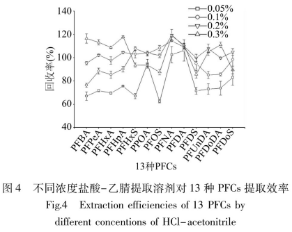 與此同時(shí),調(diào)查了0.05%、0.1%、0.2%、0.3%網(wǎng)個(gè)不一樣濃度值硫酸-乙腈對(duì)各種動(dòng)物原性食品類中13種PFCs的獲取同成品率。圖4結(jié)果顯示,在0.05%~0.3%范同內(nèi),9種PFCAs的利用率基本上是逐步提升發(fā)展趨勢(shì),4種勢(shì),0.1%、0.2%、0.3%硫酸-乙腈的利用率均在有效范疇內(nèi),各自為76.3%~114.6%、95.3%~119.4%、85.8%~118.9%。以上三個(gè)濃度值全是適合的獲取濃度值,但0.2%硫酸-乙腈的利用率較集中化,遍布在95%~120%之問,最少利用率95.3%均超過其它2個(gè)濃度值;與此同時(shí)為防止提升硫酸使用量對(duì)事后剖析造成十?dāng)_,因此 挑選0.2%硫酸-乙腈做為獲取有機(jī)溶劑。在提煉全過程中,0.2%硫酸-乙腈使試品栽培基質(zhì)中很多蛋白質(zhì)水解產(chǎn)生沉積,并利用快速離心式除去。但含脂量較高的試樣開展蛋白沉淀時(shí),易將試樣中的脂質(zhì)和水溶殘?jiān)搏@取出去,導(dǎo)致萃取液渾濁,很有可能對(duì)LC-MS/MS剖析造成栽培基質(zhì)影響,因而對(duì)萃取液要進(jìn)一步凈化處理。