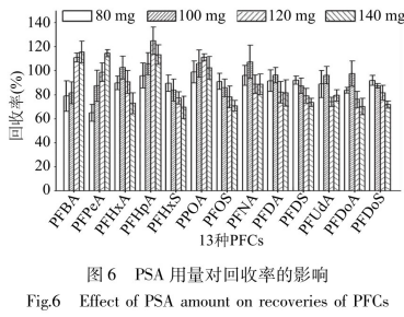 PSA是一種弱陰離子交換劑,能夠吸咐糖類與碳水化合物、有機(jī)物、小量黑色素等正負(fù)極影響化學(xué)物質(zhì)。在空缺試品中加上日標(biāo)物,做2μg/kg加上濃度值3個(gè)平行面,在80mgC18凈化處理基本上,與此同時(shí)添加80~140mgPSA觀查PFCs的叫成品率轉(zhuǎn)變狀況。由圖6能夠 獲知伴隨著PSA使用量的提升,PFCAs利用率呈先升高后下降趨勢(shì),并在100、120mg時(shí)利用率做到有效最高值;PFSAs同成品率呈下降趨勢(shì),80、100mg同成品率是83.9%~92.1%。綜合性考慮到,挑選100mgPSA為最好使用量。但凈化處理后的溶劑有黑色素殘余,必須添加GCB除去。