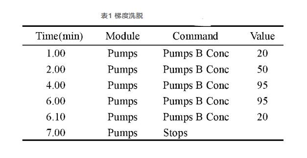 高效液相標(biāo)準(zhǔn):離子交換柱:Shin-packXR-ODSIIIC18(2.0mmI.D*150mmL.,3.0μm);進(jìn)樣量:10µL;流動(dòng)性相:A:0.02%苯甲酸-2mmol/L乙酸銨,B:工業(yè)甲醇;柱溫:40℃;流動(dòng)速度:0.3mL/min;停留時(shí)間:10ms。過(guò)柱方法:梯度方向過(guò)柱,見(jiàn)表1。