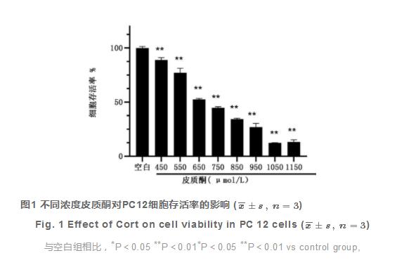 試驗數(shù)據(jù)顯示,皮層酮對PC12體細胞的損害水平隨濃度值呈依賴感升高,450、550、650、750、850、950、1050、1150 μmol/L皮層酮功效PC12體細胞48 h后,其體細胞成活率各自為88.81±2.21%、77.07±4.21%、52.47±0.99%、44.78±0.95%、34.26±0.91%、26.96±3.36%、12.32±0.22%、13.21±2.02%。見圖1。