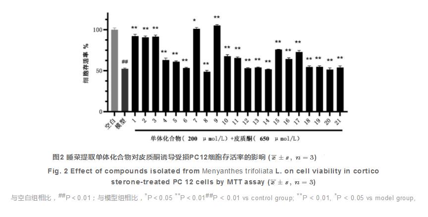 試驗數(shù)據(jù)顯示,與650 μmol/L皮層酮組對比,化學(xué)物質(zhì)1、2、3、4、5、7、9、10、11、15、16、17與650 μmol/L皮層酮一同功效PC12體細胞48 h后,體細胞成活率分別提升至92.29±2.31%、90.74±1.61%、91.62±1.83%、63.11±2.30%、61.01±1.21%、101.18±1.56%、105.23±1.11%、67.77±1.89%、65.66±1.06%、75.94±0.24%、64.39±1.47%、72.88±1.82%。苯丙素、木脂素、黃酮類、單萜類均有不一樣水平的推動650 μmol/L誘發(fā)的PC12細胞的增殖的功效。在其中,4-O-現(xiàn)磨咖啡酰奎尼酸甲酯(1)、綠原酸甲酯(2)、綠原酸(3)、腫柄梅瑰苷(7)、蘇式-(7R,8R)-愈創(chuàng)木基丙三醇-8-香草醛醚(9)推動650 μmol/L誘發(fā)的PC12細胞保護功效更為明顯,試驗結(jié)果見圖2。