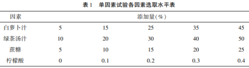蔬果汁復(fù)合型飲品其不一樣原材料的配制是影響到最后產(chǎn)品品質(zhì)的首要要素。最先對于白蘿卜汁的增加量、綠茶葉料汁的增加量、綿白糖的增加量、及其檸檬酸鈉的增加量對設(shè)備的危害,融合感觀評判規(guī)范綜合分析,以科學(xué)研究以上四個要素對蘿卜綠茶葉復(fù)合型飲品口味的危害。四個要素選擇的水準(zhǔn)見表1,當(dāng)科學(xué)研究在其中一種要素變動的危害時,別的要素采用中位值濃度值。