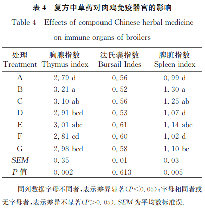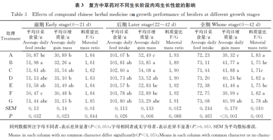 由表3由此可見,實驗早期(0~21d),B組肉食雞均值日吃料量明顯高過A組和F組(P<0.05),且其均值日增品質(zhì)明顯高過除C組和E組外的別的每組(P<0.05)。實驗中后期(22~42d),C組肉食雞均值日吃料量和平均日增品質(zhì)均明顯高過A組和E組(P<0.05),B組肉食雞均值日增品質(zhì)明顯高過A組、E組和F組(P<0.05)。從全期(0~42d)看,各解決組肉食雞均值日吃料量無顯著性差異(P>0.05),但B組肉食雞均值日增品質(zhì)明顯高過A組、d組和F組(P<0.05),且C組、E組、G組肉食雞均值日增品質(zhì)明顯高過A組(P<0.05),而A組肉食雞料質(zhì)量比明顯高過B組、C組和E組(P<0.05),B組肉食雞料質(zhì)量比明顯小于d組和F組(P<0.05)。