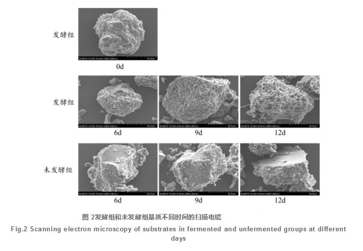 圖2為發(fā)醇組和未發(fā)醇組到不一樣日數(shù)時菌質(zhì)的表觀形狀圖。由圖2得知,在發(fā)醇組,伴隨著灰樹花發(fā)酵時間的增加,栽培基質(zhì)構(gòu)造造成很多微小的孔隙度,在發(fā)醇終點站時,栽培基質(zhì)從外到內(nèi)均發(fā)生了很大的孔隙度,構(gòu)造幾近溶散,對比于發(fā)醇組,未發(fā)醇組栽培基質(zhì)在0~12d的表觀構(gòu)造形狀均未出現(xiàn)突出的轉(zhuǎn)變,構(gòu)造均比較詳細(xì)高密度。