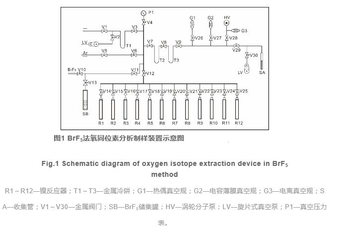 將國家行業(yè)標(biāo)準(zhǔn)化學(xué)物質(zhì)GBW04409(石英石)用瑪瑙研缽研磨至200目(0.075 mm),各自稱量氧氣含量大概5 mg的樣品放置真空干燥箱內(nèi),于105℃烤制去氣2 h后轉(zhuǎn)到空氣干燥器內(nèi)預(yù)留。在預(yù)真空包裝的鎳管式反應(yīng)器內(nèi)充進(jìn)0.4 MPa的氬氣,并將空氣干燥器內(nèi)稱重預(yù)留的樣品用短柄匙裝進(jìn)鎳管式反應(yīng)器底端,并快速接回來制樣設(shè)備。根據(jù)旋內(nèi)置式真空泵抽系統(tǒng)軟件低真空泵,與此同時在管式反應(yīng)器外界套上熱處理爐以200℃對試件及管式反應(yīng)器加溫去氣30 min后,將系統(tǒng)軟件轉(zhuǎn)到高真空泵,當(dāng)真空值做到5×10-5 Pa后再次真空包裝約2 h。撤掉熱處理爐,套上冷卻循環(huán)水,在管式反應(yīng)器外衣上液態(tài)氮對其實現(xiàn)充足冷藏,并將反映需要5倍的BrF5凍入管式反應(yīng)器內(nèi),再度抽系統(tǒng)軟件低真空泵、高真空泵。