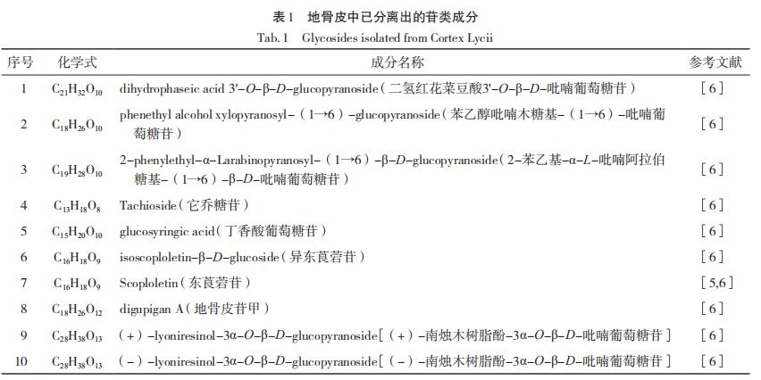 地骨皮水提物及醇提物中剝離獲得了苷類物質(zhì)。運(yùn)用醇有機(jī)溶劑開展剝離的效果較高,分離出來出的化學(xué)物質(zhì)類型較多,實(shí)際地骨皮中已分離出來出的苷類成份見表1。