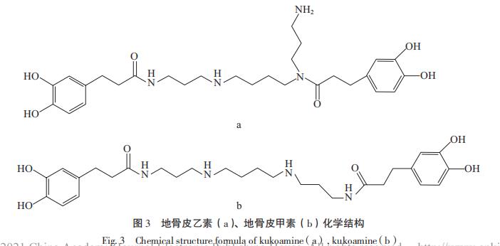 地骨皮中帶有4個環(huán)八肽化學(xué)物質(zhì),各自為枸杞子素A、B、C、D。李晟鶴等從地骨皮中拇指認(rèn)出來環(huán)肽類成份3個及5個別的成份。除此之外,地骨皮中還帶有丙烯胺成份,包含kukoamines酚氟苯和其他類型酚氟苯等,在其中2、13、14號成份有著明顯的抗感染活力。主要成分和成份化學(xué)結(jié)構(gòu)式見表2及圖3。